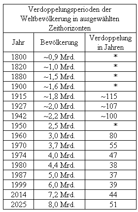 ![]() Quelle: Statistisches Jahrbuch der BRD für das Ausland, 1999, S. 208, ergänzt und angepasst In der Verknüpfung von Wachstum und Verdoppelung der Bevölkerung mag vielleicht verblüffen, dass die nominalen Unterschiede auf den ersten Blick gar nicht so wesentlich erscheinen. Aber selbst geringste Unterschiede in der Wachstumsrate haben oft erhebliche Auswirkungen durch den sog. Zinseszins-Effekt. Danach stehen Wachstum und Verdoppelungszeit rein rechnerisch wie folgt im Verhältnis: Ein Wachstum von 1,5 % führt in 48 Jahren zur Verdoppelung, bei 2,0 % in 37 Jahren und bei 3,5 %, wie derzeit noch in einigen Ländern Afrikas, in etwa 22 Jahren! |