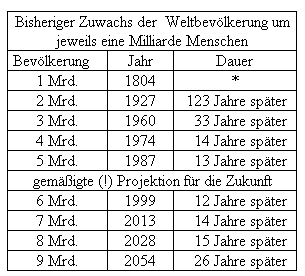 Das Maximum des relativen Wachstums ist heute bereits überschritten. Es lag mit knapp 2,5 % in der zweiten Hälfte der 1960er Jahre. Auf der Erde lebten damals noch ca. 3,5 Milliarden Menschen, womit der absolute jährliche Zuwachs "nur" etwa 60 Millionen betrug. Bis heute ging die Wachstumsrate wieder auf 1,33 % zurück, aber bei einer Weltbevölkerung von sechs Milliarden Menschen bedeutet das eine Zunahme von rund 80 Millionen pro Jahr! Anders ausgedrückt: Trotz Rückgang der Wachstumsrate stieg die absolute Zunahme der Weltbevölkerung bisher noch weiter an. Darum hat sich die Zeitspanne, in welcher die Weltbevölkerung um jeweils eine Milliarde zunahm, bis heute auf zwölf Jahre verkürzt. Bisheriger Zuwachs der Weltbevölkerung um jeweils eine Milliarde Menschen