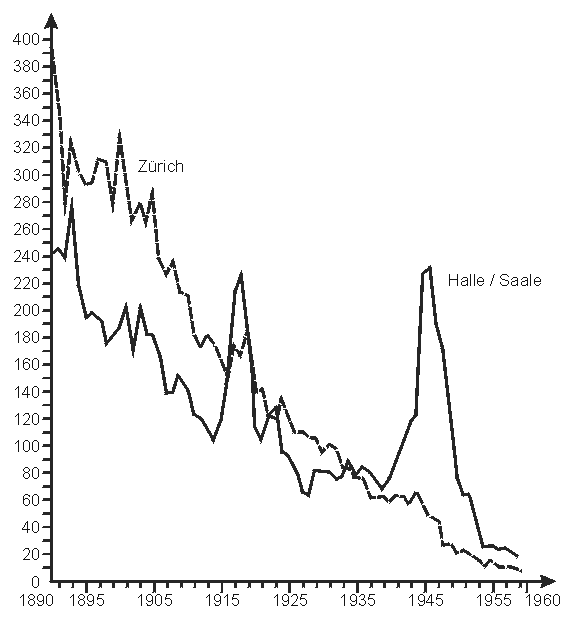 | Andererseits haben bestimmte Krankheiten, die früher oftmals bereits als Kinderkrankheiten zum Tode führten, durch das Wirken der modernen Medizin in vielen Regionen der Erde ihre Gefahr fast verloren. Dabei ist zu bedenken, dass die Kenntnisse über Ursachen verschiedener Krankheiten nicht möglich war, bevor leistungsfähige Mikroskope hergestellt wurden. So entdeckte ROBERT KOCH den Tuberkel-Bazillus erst im Jahre 1882, worauf Ansteckungswege und Gunstfaktoren der Ausbreitung der Krankheit identifiziert wurden. Trotz der danach entwickelten Vorbeugemaßnahmen starb in Europa um 1900 noch jeder siebente Erwachsene. Dennoch waren die Strategien zur Bekämpfung der Tuberkulose auf Grundlage von verbesserter Hygiene und gezielter Ernährung so erfolgreich, dass der 1921 von LÉON CHARLES CALMETTE und GUÉRIN (USA) entwickelte Impfstoff, der 1924 erstmals zur TBC-Schutzimpfung für Kinder in Frankreich eingesetzt wurde, zunächst nur marginale Bedeutung für die weitere Verringerung der Todesursache TBC hatte. Einen viel stärkeren Einfluss auf die TBC-Entwicklung hatten kurzfristige Beeinträchtigungen des Lebensstandards der Bevölkerung, insbesondere in bzw. nach den beiden Weltkriegen sowie in der Zeit der Inflation in den 1920er Jahren, wie am Beispiel der Stadt Halle an der Saale im Unterschied zum vom Krieg nicht betroffenen Zürich zu erkennen ist . Todesfälle an Lungentuberkulose in Halle und Zürich je 100 000 Einwohner