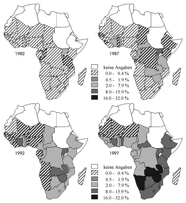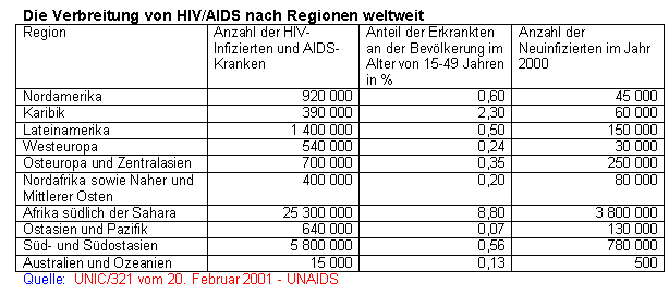 Zumindest aus diesen Gründen stimmt es zuversichtlich, wenn der UNO-Generalsekretär Kofi Annan am 17. Mai 2001 AIDS als "eine der größten Herausforderungen der Gegenwart" bezeichnet und in seiner Eröffnungsansprache der Sonderkonferenz der UN-Vollversammlung in New York am 27.06.2001 feststellte, dass die Welt endlich aufgewacht sei und sich der Epidemie stelle. Er forderte, die Ausgaben für den Kampf gegen AIDS auf das 5fache der zur Zeit 1,8 Milliarden Dollar pro Jahr zu erhöhen. (ebenda) Aber auch in jenen Regionen, welche vor dem Hintergrund eines gut funktionierenden Gesundheitssystems sowie nach jahrelanger massiver AIDS-Aufklärung einen Vorsprung in der AIDS -Prävention haben, ist diese Krankheit noch keineswegs eingedämmt. So sind im Jahr 2000 allein in Westeuropa weitere 30 000 sowie in Nordamerika sogar 45 000 Menschen mit dem HI-Virus infiziert worden (UNIC/321 vom 20. Februar 2001). Die Anzahl der Neuansteckungen in Deutschland wird auf jährlich 2000 geschätzt. Die Verbreitung von HIV/AIDS in Afrika nach Staaten 1982 bis 1997