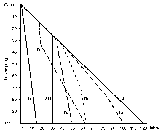 | Die Sterblichkeit von Populationen setzt sich aus den Sterblichkeiten von Individuen zusammen, die ebenfalls standardisierbaren Lebensabläufen folgen. In der Humanökologie wird zunächst zwischen den maximal möglichen Lebenserwartungen unterschieden, deren Differenzen sowohl genetisch begründet als auch durch die Lebensweise beeinflusst werden können . Daneben treten im Leben der meisten Menschen Ereignisse auf, die in unterschiedlicher Intensität temporär oder permanent diese theoretisch mögliche Lebenserwartung reduzieren (Kurven Ia bis Id), wogegen bislang keine Umstände bekannt sind, einmal erfahrene Verluste an Lebenserwartung wieder aufzuholen. Ein Spezialfall ist der unabhängig von der theoretischen Lebenserwartung eintretende Tod durch äußere Einwirkungen (Kurve III). Abstrakte Lebensabläufe ![]() Quelle: FREYE 1978, S. 153, ergänzt |