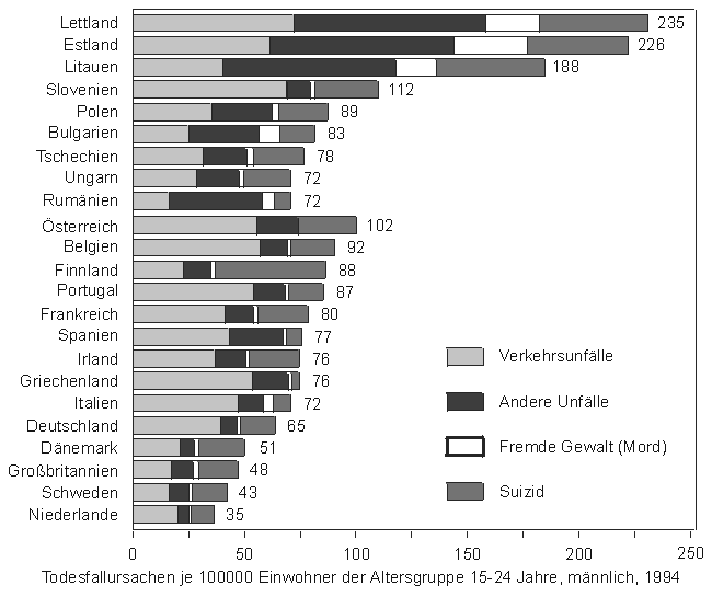 | Zu den statistischen Randbereichen, die zu einem nicht klar definierten Anteil ebenfalls mit der Mortalität zu tun haben, zählen Vermisste. In Deutschland wurden, ähnlich wie in den Jahren zuvor, allein im Jahr 2000 immerhin 76 500 Personen vermisst. Von diesen Fällen werden in der Regel nur 80 % aufgeklärt, was aber nicht in jedem Fall bedeutet, dass die Betreffenden lebend gefunden werden. Zugleich bleiben die übrigen 20 %, immerhin jährlich rund 15 000 Personen, zwar vermisst, werden aber in der Statistik dennoch weiter geführt, denn das deutsche Melderecht arbeitet auf Anmeldungsbasis. Todesfälle von am Ort gefundenen nicht identifizierten Personen können zwar durch eine "Abmeldung von Amtswegen" aus dem Melderegister gestrichen werden, bleiben in der Statistik aber als "Meldefehler" erhalten, der nur durch eine erneute vollständige Volkszählung zu korrigieren ist. Das bedeutet für Deutschland, dass von der Volkszählung 1987 (bzw. 1981 in der DDR) bis zur geplanten Volkszählung 2002 ein statistischer Fehler von etwa einer viertel Million Personen allein durch Vermisste aufgelaufen sein könnte. Nichtnatürliche Todesfälle (männlich) je 100 000 Einwohner der Altersgruppe 15-24 Jahre ausgewählter europäischer Staaten, 1994