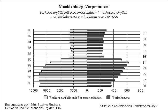 Quelle: MICKLEWRIGHT; STEWART 2000, S. 16 Während in fast allen Staaten Mittel- und Westeuropas die Straßenverkehrsunfälle unter den nicht natürlichen Todesarten mit über 50 % dominieren, treten sie bei deutlicher Zunahme der Jugendmortalität in Richtung Osten zurück, liegen im Baltikum sogar teilweise unter den Werten der enorm hohen Suizidrate. Dort liegt unter den Ursachen die Rate der Unfälle außerhalb des Straßenverkehrs an erster Stelle. Bedenklich stimmt die statistisch signifikante Häufigkeit der Todesfälle infolge fremder Gewalt. Verkehrsunfälle mit Personenschaden und Verkehrstote nach Jahren 1980-99 in Mecklenburg-Vorpommern ![]() Bezugsbasis vor 1990: Bezirke Rostock, Schwerin und Neubrandenburg Quelle: Statistisches Landesamt Mecklenburg-Vorpommern Anteil der bei Verkehrsunfällen unter Einfluss von Alkohol verunglückten Personen in ausgewählten Bundesländern 1999 in %