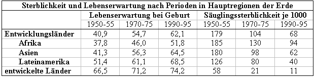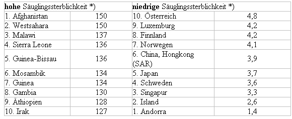 Ende des 20. Jahrhunderts lag die globale Sterberate schätzungsweise bei 0,88 %. Dabei entfallen auf die Industriestaaten insgesamt etwa 1,00 %, wogegen der Gesamtwert für die Entwicklungsländer bei 0,85 %, unter Aussparung von China bei 0,92 % liegt (nach: DSW 1999). Ohne Beachtung der Altersgliederung könnte man also annehmen, dass die Menschen in den Entwicklungsländern nicht so früh sterben, wie in den Industriestaaten. Hingegen ist angesichts der wesentlich geringer besetzten älteren Jahrgänge sogar von einer außerordentlich hohen Sterblichkeit zu sprechen. Diese geht insbesondere auf eine sehr große Kinder- und Säuglingssterblichkeit zurück. Die 10 Länder mit der höchsten und der niedrigsten Säuglingssterblichkeit
