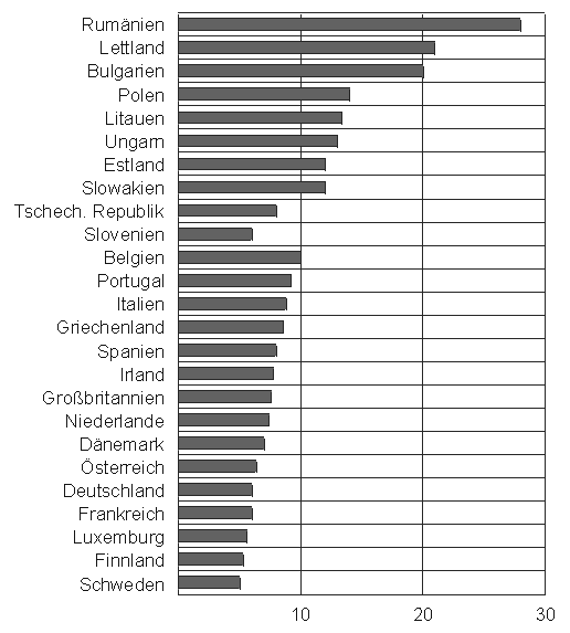 ![]() *) Jährliche Anzahl der Todesfälle von Säuglingen im ersten Lebensjahr pro 1000 Lebendgeburten. Quelle: "World Population Data Sheet 1999", Population Reference Bureau 1999 (auf deutsch: DSW-Datenposter "Weltbevölkerung 1999"). Die hochgradige Korrelation zwischen der Säuglingssterblichkeit und der Lebenserwartung wird hier deutlich. ![]() Quelle: Münz; Ulrich 1994, S. 10 Doch auch in den Staaten Europas sind die Überlebenschancen für Kinder keineswegs homogen gering. Insbesondere in den Transformationsländern Osteuropas sind momentan Sterberaten zu finden, die gewöhnlich für armen Entwicklungsländer typisch sind. Das ist insbesondere darum bedenklich, als dass bis zum Zusammenbruch der sozialistischen Regimes die Werte in der Regel wesentlich günstiger waren. Kindersterblichkeit in den ersten fünf Lebensjahren je 1000 Geborene ("Unter-5-Mortalitätsrate"), ausgewählte Staaten Europas