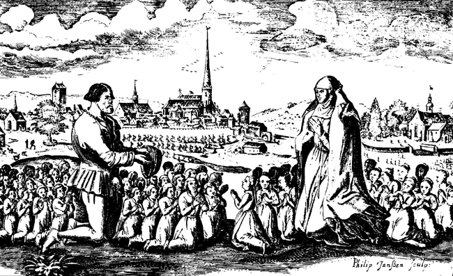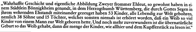 Die wahrscheinlich größte Anzahl Kinder, die jemals von einer einzelnen Frau geboren wurde*, geht allerdings noch weit darüber hinaus. Im Jahre 1503 verstarb im württembergischen Bönigheim Frau Barbara Schmotzerin, Ehefrau des Herrn Adam Stratzmann, die mit 18 Einzelgeburten, fünfmal Zwillingen, viermal Drillingen, einmal sechs und einmal sieben Kindern insgesamt 29 Geburten gehabt und damit 38 Söhnen und 15 Töchtern, also 53 Kindern das Leben geschenkt haben soll! Der Fall ist durch eine glaubhafte Chronik erhalten im Gemminger Archiv, ein Kirchengemälde von 1508, den Untersuchungsbericht eines Hofbeamten an Kaiser Maximilian I. aus dem Jahre 1509 sowie eine Dokumentation im Rathaus von 1650 bestätigt. |