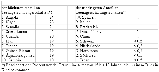 Die hohe Fruchtbarkeit insbesondere in vielen afrikanischen Ländern steht in engem Zusammenhang mit dem biographisch frühe Eintritt in die Mutterschaft. Wohl nirgendwo auf der Erde werden so viele Mädchen und junge Frauen schwanger, wie auf diesem Kontinent. Die Statistik weist diesen Umstand unter dem Begriff "Teenagerschwangerschaften" aus (vgl. Abbildung). Leider gibt es für den internationalen Vergleich keine verlässliche Aussagen zur sozialen Position, der Bildung und ähnlichen Indikatoren der Betroffenen. Es kann allerdings - mitteleuropäische Maßstäbe angelegt - davon ausgegangen werden, dass ein sehr hoher Anteil von Teeny-Müttern Ausdruck von Schwächen in der sozialen Ordnung einer Gesellschaft ist.