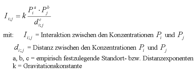 Der Umfang der Interaktion (Migration) zwischen räumlichen Einheiten verhält sich negativ exponentiell zur Distanz, d.h. je größer die Distanz, desto geringer ist die Interaktion. Der Exponent ist ein empirisch zu bestimmender Koeffizient, welcher - ähnlich wie im NEWTONschen Masseanziehungsgesetz - nahe bei 2 liegt. Als "Massen" gelten im Gravitationsansatz die potentiell wandernden Personen, d.h. die Einwohner der betrachteten Raumeinheiten mit einem normierten Migrationspotential. Oft werden die "Massen" sogar mit den Bevölkerungszahlen gleichgesetzt. Es lässt sich rechnerisch leicht nachvollziehen, dass das Wanderungsvolumen nicht nur ansteigt, wenn sich die Distanz verringert, sondern auch, wenn die Masse von zwei betrachteten Regionen größer ist als die Masse anderer Regionen. Mit freiem Distanzexponenten lautet der Ansatz: