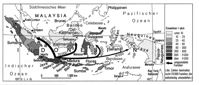 Unter den Beispielen planmäßiger Besiedlung ist die Umverteilung von Menschen in Indonesien eine Besonderheit, denn in diesem Fall ist der Anlass politische Wunsch nach Abbau von Verdichtungen insbesondere auf den Inseln Java und Madura. Ob auf diesen nach der Einwohnerzahl wichtigsten Inseln Indonesiens die Tragfähigkeit wirklich erschöpft ist, soll an dieser Stelle nicht diskutiert werden, obgleich allein die durch den Bevölkerungszuwachs erfolgte Belastung des Naturhaushaltes offenkundig ist, wie sowohl anhand der Luftverschmutzung als auch der bisher bekannten Vernichtung der Regenwälder aufgezeigt werden könnte.