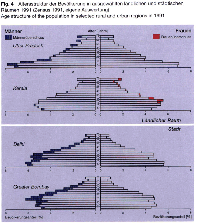 ![]() Anmerkung: 1992 wurde die Meldepflicht für afrikanische Immigranten eingeführt, um sie aus der Illegalität zu holen. Quelle: TYRAKOWSKI 1999, S. 41 Sowohl aus bevölkerungsgeographischer wie auch aus demographischer Perspektive sind qualitative Parameter der Immigranten von Bedeutung. Dabei fallen zunächst die starken Unterschiede in der Alters- und Geschlechtsstruktur zwischen den Arbeitsmigranten und der Bevölkerung im Zielland auf. Arbeitsmigranten sind überproportional jung, und in der Regel dominieren Männer. Das ist nicht nur in Mitteleuropa so, sondern selbst in Entwicklungsländern, wie am Beispiel von Indien bei der Gegenüberstellung ländlicher Quellgebiete und städtischer Zielräume von Arbeitsmigranten deutlich wird . Alters- und Geschlechtsgliederung der Bevölkerung in ausgewählten ländlichen und städtischen Räumen 1991