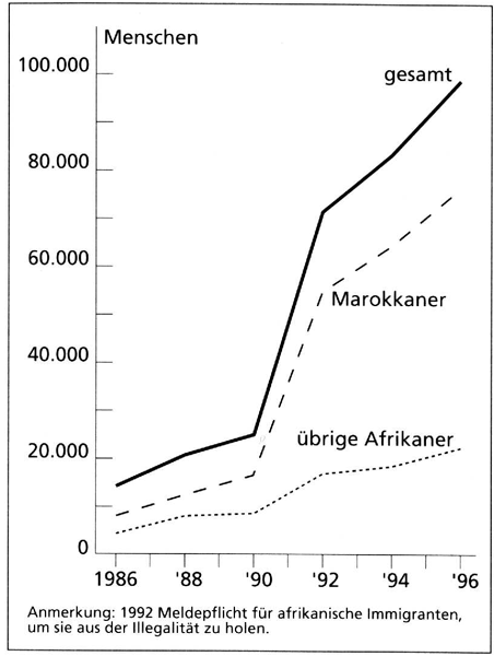 | Aus bevölkerungsgeographischer Sicht ist zudem die räumliche Verteilung und Umverteilung der Gastarbeiter von besonderer Bedeutung. So haben fast alle mediterranen Arbeitnehmer ihre ersten Siedlungsräume in Deutschland an Standorten und im Umfeld industrieller Ballungen gefunden. Ausgehend von den Großräumen München und Stuttgart-Ludwigsburg wurden die Räume Nürnberg und Frankfurt/Main erschlossen, erst später der Raum Köln und dann die Standortbereiche Bielefeld, Hannover, Wolfsburg, Hamburg und Bremen (in der Reihenfolge der Nennung, vgl. RUPPERT 1982, Abbildung 33, S. 52). Eine Ausnahme bei diesen Arbeitswanderungen spielte der damalige besondere politische Status von (West-)Berlin, wohin nach der Energiekrise vor allem viele türkische Familien übersiedelten. Dabei kam es zur besonderen Konzentrationen. In Kreuzberg lag der Anteil der Ausländer an der Wohnbevölkerung 1987 bei knapp 27 %; er stieg bis 1995 auf über ein Drittel. Legale Einwanderer nach Spanien von 1986 bis 1996