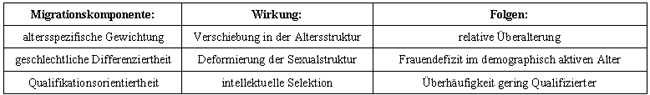 ![]() Quelle: WEISS, HILBIG 1998, S. 797 Migration ist immer selektiv, selten aber so langanhaltend und inhaltlich gleichförmig, wie in den ländlichen und zugleich landwirtschaftlichen Gebieten des Ostens. Ihr Ergebnis ist allerdings nicht einfach als "Erbe der DDR" abzubuchen, sondern sie setzt sich teilweise unvermindert fort, was vielerorts, ja bereits regional zu einer extremen Schieflage in der Alters-, der Sexual- und der Qualifikationsstruktur der Bevölkerung der Wegzugsgemeinden führte. Vor 1990 waren die demographisch-soziologischen Disproportionen vorrangig auf die von der Landwirtschaft geprägten, ländlichen Gemeinden beschränkt. Die damalige Bevorteilung der Städte, vorrangig durch den staatlichen Wohnungsbau sowie die Kontingentierung von Wohnungen über Kommunen und Betriebe, führte zu einer migrationellen Protegierung dieser Standorte. Der Beitritt zur BRD brachte neben anderen Freiheiten insbesondere die Aufhebung der Wanderungsbeschränkungen. Prompt verloren die Zentren ihre vorherige Bevorzugung, und ihre Wanderungseffektivität glich sich sehr schnell dem umliegenden ländlichsten Raum an. Am Beispiel der größten Stadt im Nordosten Deutschlands, der Hansestadt Rostock, deren Einwohnerzahl vor 1989 bei rund 250 000 und deren Männerüberschuss im demographisch aktivsten Alter (20 bis unter 40 Jahre) bei 3,7 % lag, wird das besonders deutlich: Im Jahre 1996, mittlerweile auf etwa 200 000 Einwohner geschrumpft, überschritt sie den Schwellenwert von 10 % Männerüberschuss (gleiche Altersgruppe). Aktuell (2001) strebt der Wert sogar gegen 15 %. Diese strukturelle Verschiebung ist fast ausschließlich Resultat der überregionalen Migration und hat kaum eine Beziehung zur intensiven Stadt-Umland-Wanderung! |
