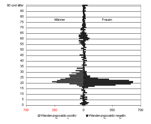 Daten: Statistisches Landesamt Mecklenburg-Vorpommern. Seitens der demographisch-soziologischen Disproportionen ist die überproportionale Abwanderung von jungen Frauen zwar statistisch relativ leicht zu dokumentieren, aber durch die Öffentlichkeit und insbesondere die Politik verhältnismäßig spät zur Kenntnis genommen worden. Das ist durchaus verständlich, denn spätestens seit der Industrialisierung sind es fast überall auf der Erde vorrangig die jungen Männer, die zeitweilig oder auch für länger zur Arbeit in die wirtschaftlichen Zentren abwandern. In Griechenland gibt es aus diesem Grunde viele Inseln fast ohne Männer; selbst in Indien, wo der natürliche Überschuss männlicher Kinder im ländlichen Raum (z. B. in Kerala) durch Formen des Infantizits seit Jahrzehnten künstlich überhöht wird, gibt es in den Altersgruppen 15 bis 30 Jahre erhebliche Frauenüberschüsse , weil sich die Männer zur Arbeit in den großen Zentren der industrialisierteren Provinzen aufhalten. Migrationsbereitschaft nach Landesteil und Geschlecht (Angaben in Prozent)