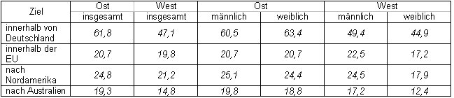 Quelle: Deutsche Shell, S. 293. Von den Autoren der Studie wird folgende Interpretation angeboten: "Ihre ungünstigen Lebensbedingungen und biographischen Belastungen kompensieren die Mädchen und jungen Frauen im Osten offenbar durch einen strikten Verzicht auf die weibliche "Tugend" [Hervorhebung im Original] des Zurückstehens hinter den Interessen anderer. Dieses Gleichziehen bei der Verwirklichung der eigenen Interessen ist im Westen noch nicht erreicht, hier ist die Rücksichtnahme auf andere bei den Mädchen klar stärker ausgeprägt als bei den Jungen" (S. 293). Der Hinweis auf die Qualität der ostdeutschen Lebensbedingungen sowie der biographischen (!) Belastungen (Bezug zum Geburtsort im Osten?) ist nicht nur eine recht gute Kennzeichnung, sondern zugleich der Kern der Ursache der Abwanderung, wenn der Ansatz der "regionalen Tragfähigkeit" zugrunde gelegt wird. |
