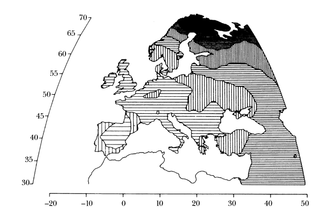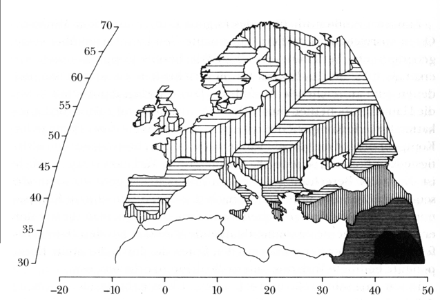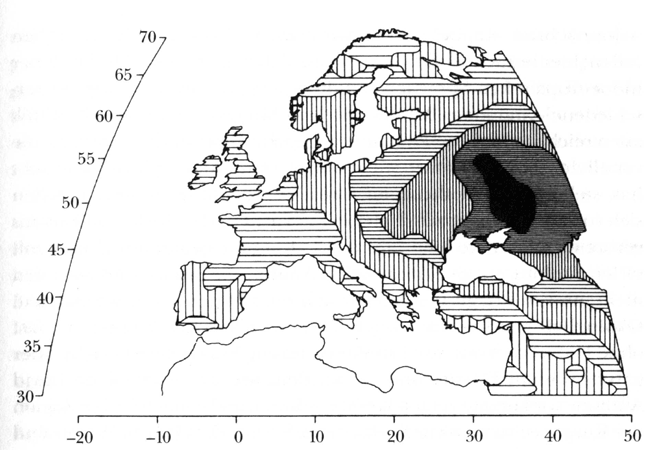 Karte der dritten Hauptkomponente der Gene in Europa (bei 95 Genen; neue Version, von Piazza und Koll.,1995): sie zeigt eine Expansion, die von der Kurgan-Region ausgeht, laut Mirjia Gimbutas die Ursprungsregion der indoeuropäischen Sprachen ![]() Die vom Kurgan-Gebiet ausgehende Expansion begleitet die Ausbreitung der indoeuropöischen Sprachen. nach: CAVALLI-SFORZA 1999, S. 133; leicht verändert |