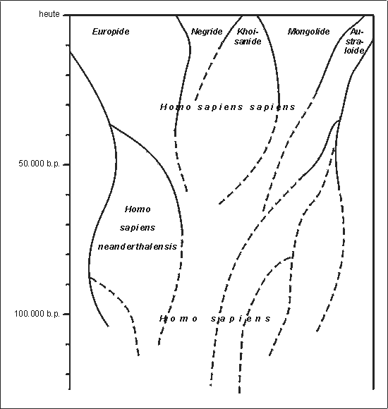 ![]() Die moderne Anthropologie unterscheidet auch beim Menschen genotypische (z. B. Blutgruppen) und phänotypische Merkmale (Unterschiede in der Erscheinung infolge der Lebensumstände, z. B. Hautfärbung nach Reizung durch UV-Licht, Fettleibigkeit durch Fehlernährung). Sie rückt auch immer stärker vom Begriff der Rasse ab. In Deutschland wird zumeist nur noch von "typologischen Kategorien" gesprochen, was hier allerdings eher als Reaktion auf den Missbrauch der Anthropologie durch den Faschismus zu verstehen ist, genauer: Die Wissenschaft schützt sich vor dem Verdacht des Rassismus. Zugleich weicht sie damit Diskussionen aus, die als eine Art "biologistische Falle" den wissenschaftlichen Erkenntnisfortschritt behindern können, denn die Bezeichnung kann auf genotypische und phänotypische Merkmale gleichermaßen angewendet werden. Karte A Karte der ersten Hauptkomponente der Gene in Europa (bei 95 Genen;1993: sie zeigt die Expansion der ersten neolithischen Ackerbauern vom Mittleren Osten aus. Diese stellt das Rückgrat der Genetik Europas dar. ![]() Karte B Karte der zweiten Hauptkomponente der Gene in Europa (bei 95 Genen;1993: sie zeigt einen Gradienten von Nord nach Süd: eine Anpassung ans Klima, begleitet oder möglicherweise verursachtvon der (durch die)Ausbreitung der Sibirier mit uralischer Sprache bis in den äußersten Norden Europas ![]() Die Anpassung an das Klima korreliert mit der Ausbreitung der Sibirier mit uralischen Sprachen bis in den äußersten Norden Europas. nach: CAVALLI-SFORZA 1999, S. 131; leicht verändert Karte C