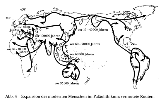 Allerdings sollten beide Seiten nicht voneinander isoliert betrachtet werden, da sie vielfach einander bedingen. Zugleich ist zu berücksichtigen, dass die Expansion des modernen Menschen und seine Differenzierung in Rassen über einen langen Zeitraum hinweg als migrationeller Prozess stattfand. Er vollzog sich in verschiedenen Etappen und auf bestimmten Routen, wo der jeweils "modernere" Mensch auch auf vorherige Entwicklungsstufen traf, mit denen er seine genetischen Potentiale entweder kombinierte oder die er existenziell ablöste, wie der Cro-Magnon-Typ den Neandertaler in Europa. Diese räumliche Verbreitung der rezenten Typen ist quasi ein zusätzliches geographisches Moment unserer biologischen Vielfalt.