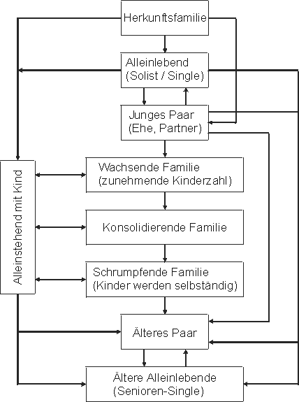 Unabhängig von der räumlichen Differenzierung gibt es allerdings für Deutschland Gesamtwerte, welche die Zunahme der Einpersonenhaushalte im 20. Jahrhundert eindrucksvoll illustrieren. So lag der Wert vor dem Ersten Weltkrieg (1910) bei nur 7,3 %, vor dem Zweiten Weltkrieg (1939) noch bei 9,8 %, stieg durch den Zweiten Weltkrieg insbesondere durch Verwitwung auf 19,4 % (1950, BRD), um dann bis 1989 fast linear auf 35,3 % zu steigen (PEUCKERT 1991, S. 39). Lebenszyklus-Phasen KEMPER 1985, S. 191, ergänzt