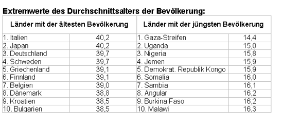 Die einfachsten Maßzahlen der Altersstruktur sind das Durchschnittsalter, das arithmetische Mittel der Lebensalter aller Personen einer Bevölkerung, und das Medianalter, der Zentralwert, welcher die Anzahl der Alten und der Jungen einer Bevölkerung in zwei gleichmächtige Gruppen teilt - ein recht grobes Maß, das allerdings für eine erste Näherung im eindimensionalen Vergleich oft ausreicht. ![]() Quelle: UN, Stand 1999