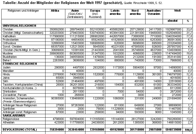 In der Literatur gibt es mehrfach Hinweise zu einer mehr oder weniger engen Beziehung von Qualifikation und Fruchtbarkeit. Verschiedentlich wurde eine hochgradige Korrelation zwischen beiden Variablen festgestellt. Eine solche Aussage hat allerdings nur eingeschränkten Wert, wenn sie keine zusätzliche Information zur Ursächlichkeit enthält und auch nicht das konkrete Bedingungsgefüge berücksichtigt wird. Ein besonderes Beispiel für relativ eindeutige Beziehungen von Qualifikationsniveau und Kinderlosigkeit (stellvertretend für Fruchtbarkeit) gibt es in Deutschland, differenziert nach Ost und West, wobei bis heute die Bedingungen in den beiden deutschen Staaten vor dem Fall der Mauer durchschlagen. Kinderlose Frauen im Alter zwischen 30 bis 39 Jahren in Deutschland (Stand 1994, in Prozent) ![]() Die räumlichen Auswirkungen der Teilhabe der Bevölkerung an Religionen ist im engeren Sinne Gegenstand der Religionsgeographie bzw. einer Geographie der Geisteshaltung. Dabei geht es u. a. um die Verbreitung der Religionen auf der Erde nach Regionen und Beteiligung, ihren prägenden Einfluss auf das Siedlungs- bzw. Landschaftsbild, ihre Einflüsse auf das Wirtschaftsleben oder den Pilgerverkehr. Die z. T. enorme Bedeutung der Religion für bevölkerungsgeographische Fragen ist aber offenkundig. Dabei gibt es allerdings kein reguläres Muster, zumal ein formales Gebot oder eine bestimmte Wertvorstellung noch kein zwingender Grund für die Umsetzung in ein konkretes Handeln sind, denn sie sind immer unterschiedlich stark verinnerlicht. Es soll hier genügen, aus der kaum überschaubaren Menge an Teilthemen heraus willkürlich einige Beispiele unvertieft zu erwähnen, bevor an passender Stelle erneut darauf Bezug genommen wird: |